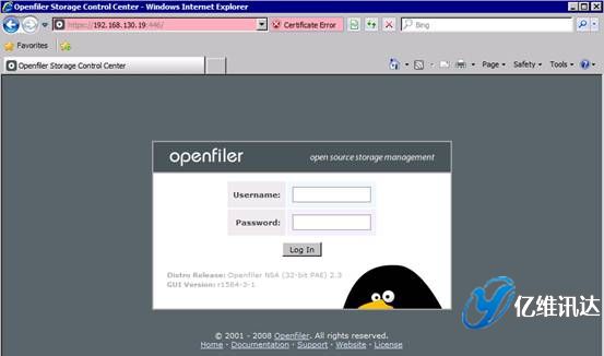Openfiler 鏡像系統(tǒng)配置當 Openfiler 系統(tǒng)安裝并重啟完成后,對系統(tǒng)所有后續(xù)的配置過程,都是以 Web 方式配置完成的。這種全部基于 Web 的系統(tǒng)配置方式,使得配置過程變得更加簡易,同時也帶來了良好的用戶體驗。首先打開瀏覽器,輸入地址:https://IP:446。注意,此處輸入的 IP 地址為在系統(tǒng)安裝時所配置的固定 IP 地址。然后使用系統(tǒng)初始默認的用戶名和密碼進行登陸。用戶名為 openfiler,密碼為 password。系統(tǒng)初始的用戶名和密碼可以在第一次登入系統(tǒng)后進行重新設(shè)置。如圖所示。
