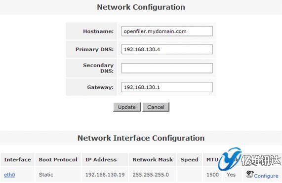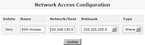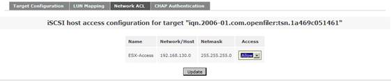 在系統(tǒng)菜單“System”菜單下的“Network Access Configuration”區(qū)域,配置允許訪問 Openfiler 系統(tǒng)的安全訪問控制列表。值得注意的是只有加入到 Openfiler 的網(wǎng)絡(luò)訪問控制列表中的網(wǎng)絡(luò)或者主機地址,才允許訪問 Openfiler 系統(tǒng)所提供的虛擬存儲服務(wù)。在網(wǎng)絡(luò)訪問控制列表中,既可以配置網(wǎng)段地址也可以配置單個主機地址。在本例填入 192.168.130.0 網(wǎng)段,設(shè)置類型為“Share”方式,添加完成后點擊“Update”完成系統(tǒng)配置更新。如圖