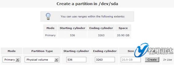 在這里,我們要創(chuàng)建一個新的分區(qū)。首先在“Create a partition in /dev/sda”處設(shè)置“Partition Type”屬性的值為“Physical volume”,在“Ending cylinder”屬性處選擇默認值,從而設(shè)置當前所有的剩余空間劃為一個分區(qū),最后點擊“Create”選項。如圖