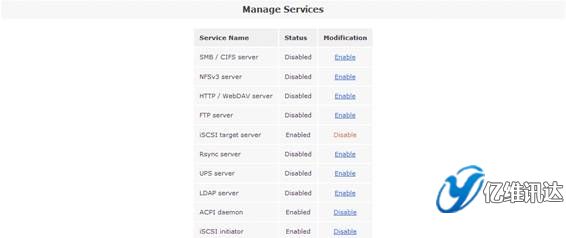 當 iSCSI 卷創(chuàng)建完成后,接下來是開啟“iSCSI target server”系統(tǒng)服務(wù)。點擊“Services”菜單,在右側(cè)的“Services section”區(qū)域選擇“Manage Services”。然后將系統(tǒng)服務(wù)列表中的“iSCSI target server”設(shè)置為“Enabled”狀態(tài),從而使得系統(tǒng)能夠?qū)ν馓峁┗?iSCSI 協(xié)議的虛擬存儲服務(wù)。如圖